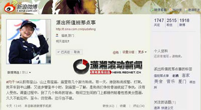 “派出所”微博的用戶注冊信息為福建廈門,介紹自己“明天值班”。他還給自己貼了“美食、音樂、老酒、客家”等標簽。自2009年10月30日開通,至今共發(fā)出1918條微博。