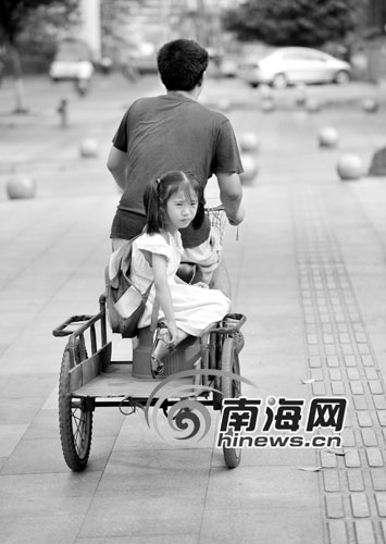 5月24日,南國都市報11版刊登的一張圖片吸引了不少市民的關注:女孩蹲在破舊的三輪車上,用手指比劃著做算術。父親蹲在三輪車旁,慈愛地看著女兒。這溫馨的一幕感動了眾多讀者和網友。網友木木留言,“大大的世界也許對這位父親而言有些難以理解,可與生俱來的父愛,讓他知道愛女兒是應該的,眼中的溫柔打動著周圍的人。父女之愛,在這一刻悄然傳遞……”這是怎樣的一對父女?25日,記者走進了他們的家。