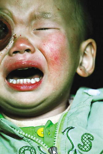 在家里,每次媽媽抱著小錦,一看到他腫大而突出的右眼,淚水就會不停往外涌。看到媽媽傷心抽泣時,小錦便會緊緊摟住媽媽的脖子,用胖乎乎的小手在媽媽的后背來回撫摸,他還不會說話,卻會用自己的方式安慰媽媽。