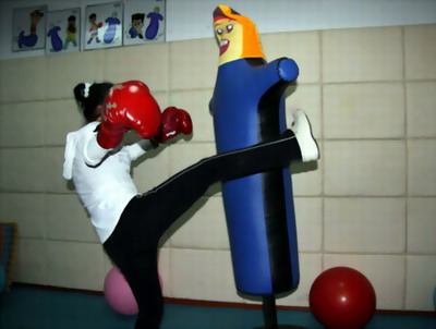 資料圖片:一名學生在“宣泄室”擊打橡膠人