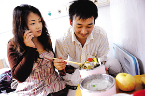 病房里,在女友的陪伴下,馮金松胃口大開。范曉林攝(圖片來源:揚子晚報)