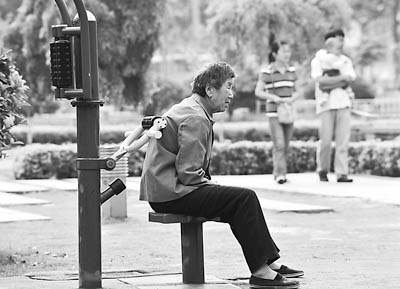 南京街頭市民廣場(chǎng),正在健身器材上按摩的老人安心攝(資料圖片)