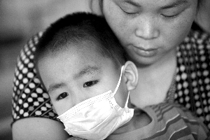 病房內,身患白血病的小鑫躺在媽媽的懷里。記者 王貴彬 攝