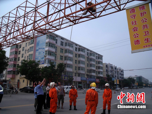 當日中午,記者到現場發現,廣告架離地面有6米多高,少年不斷在廣告架上走來走去,且情緒激動,揚言不給500元錢,將從上面跳下來。當日的最高氣溫達到將近40攝氏度,再加上少年位于近7米高的廣告架,情況萬分危急。