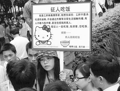 起因是這個女人手中高舉的一塊一平方米見方的白色牌子,上面赫然寫著“征人吃飯”四個大字,大字下面還有一段黑色的小字:乙肝不會通過共餐接觸傳播,我是乙肝病毒攜帶者,現征人一起吃飯,我請客,您吃飯。