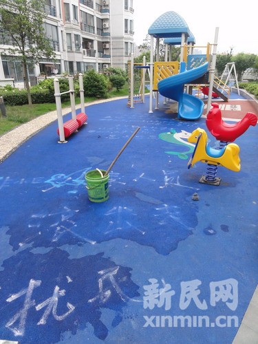 近日,家住浦東錦繡華城19街區(qū)的業(yè)主發(fā)帖稱,小區(qū)內(nèi)兒童游樂(lè)區(qū)地面上被人涂寫(xiě)了辱罵外來(lái)人員的標(biāo)語(yǔ)。7月14日,新民網(wǎng)記者采訪了涂寫(xiě)標(biāo)語(yǔ)的小區(qū)8號(hào)樓業(yè)主竹先生,他表示自己“忍無(wú)可忍才出此下策”。