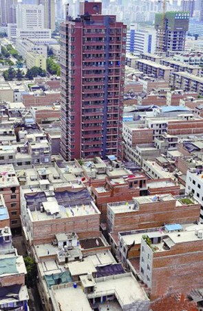 在西安市南郊電子城一個被稱作“北山門村”的城中村里,一座赭紅色的23層高樓煞是耀眼。它修建3年來如今眼看就要竣工了,當(dāng)?shù)氐南嚓P(guān)部門對此仍視而不見,無人過問,沒有任何報批手續(xù),成了真正意義上的“監(jiān)管真空”。該樓被當(dāng)?shù)孛襟w爆炒為“史上最牛的農(nóng)民大廈”,也有人稱它為“史上最高的違章建筑”。