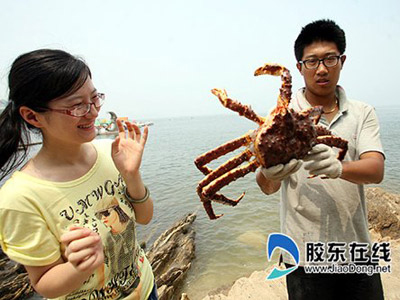 遠渡重洋來到煙臺的這幾只大螃蟹,不但體格超大,而且還有一些“特異功能”呢。矯先生告訴記者,其中那個名叫“霸王”的大螃蟹有6斤重,展開之后能有1米長,售價近2000元。“這么大的‘帝王蟹’在國內來說不多見的。”矯先生說。