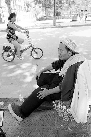 昨天中午12時,鄭州市伏牛路與隴海路交叉口向南的樹蔭里,一個頭戴藍色漁夫帽的男子引來了不少行人圍觀。