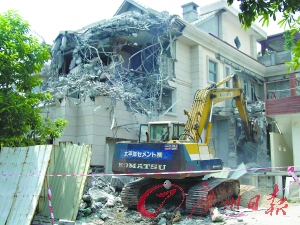 昨日上午,由于目前使用的8米臂長勾機的勾臂長度不夠,不能伸到別墅高處將違建部分拆除,城管部門增調(diào)了一臺臂長達到15米的大型勾機到場繼續(xù)強拆。