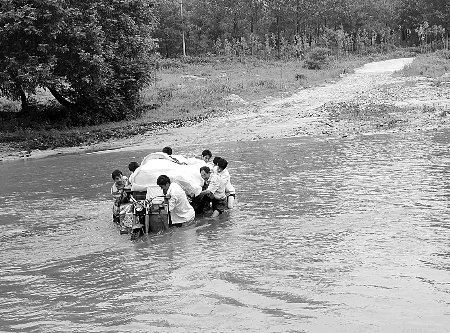 裝嫁妝的三輪車被河水阻擋。