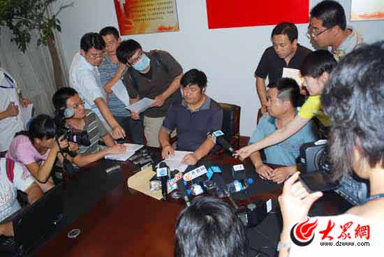 在新聞發布會現場,記者團團圍住濟南動物園黨委書記劉俊剛