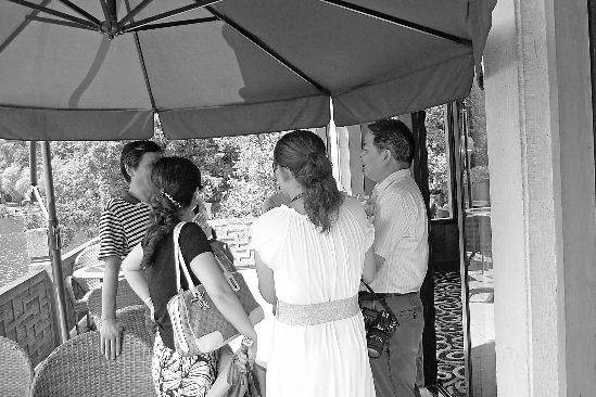 來到19年前跳水救人的現(xiàn)場(chǎng),項(xiàng)先生(右一)依然很低調(diào)。他不愿正面面對(duì)鏡頭,這是本報(bào)記者偷拍下的一張照片。