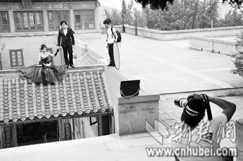 為了融入古建筑的碧瓦灰墻,不惜飛檐走壁,冒險踩在屋頂的橫梁上拍攝婚紗照。昨日下午,記者在寂靜的武大櫻園頂上看到,一對新人為拍出好照片,站的位置讓人側目。(記者劉蔚丹攝影報道)