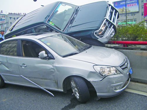 昨天清晨,杭州艮秋立交上面,發生了一起車禍,一輛“獵豹”爬到了立交橋的護欄上,左前輪懸在半空,獵豹下面還壓著一輛銀色的現代小轎車。