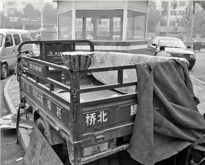 老趙的三輪車和剩下的半個西瓜。(記者 高明興 攝)