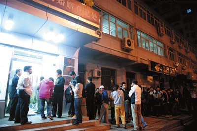 為了早點(diǎn)領(lǐng)到結(jié)婚證,一對(duì)對(duì)情侶不惜午夜就開(kāi)始排隊(duì)等候。