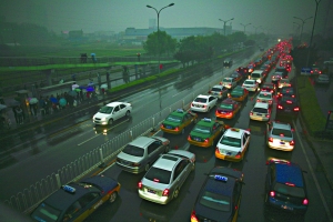 昨日,中關村東路,雨霧的天氣,交通非常擁堵。記者 浦峰 攝