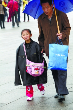 昨日,天安門廣場,一名游客脫下自己的皮夾克給孩子穿上。本報(bào)記者 周曉東 攝