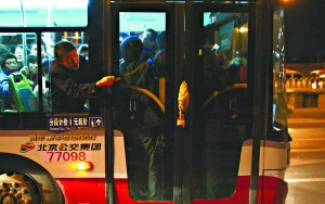 阿蘭(化名)是六里橋北里附近一名交通協(xié)管員,從2007年開始,她就在這里負責維持交通秩序。揮動小旗,右手推著乘客的背,配合著關(guān)門的節(jié)奏,順勢將乘客推上公交車。三年來,阿蘭每天早晨都要不停地重復(fù)這套動作,尤其是對擠300路、323路和661路車的乘客。