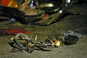 事發(fā)地點(diǎn)位于京良環(huán)島向東2公里左右的一座橋上。昨晚9時(shí)許,一輛自行車、一輛面包車和一輛小貨車依次停靠在由東向西方向車道上。面包車側(cè)翻,頂部撕開,留有大攤血跡。一輛右部受損的黑色轎車停在前方10余米處。