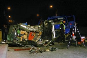 交警在事故現(xiàn)場(chǎng)勘查。昨日17時(shí)40分許,京良路京良環(huán)島2公里處發(fā)生一起多車連撞事故,4人死亡6人受傷,交通受阻4個(gè)多小時(shí)。據(jù)傷者回憶,事發(fā)時(shí),一輛面包車自西向東行駛,試圖加速超車時(shí),撞到一名騎自行車男子。隨后,面包車急打方向盤進(jìn)入對(duì)面車道,與一輛轎車相撞,緊接著又與一輛貨車相撞。本報(bào)記者 吳江 攝