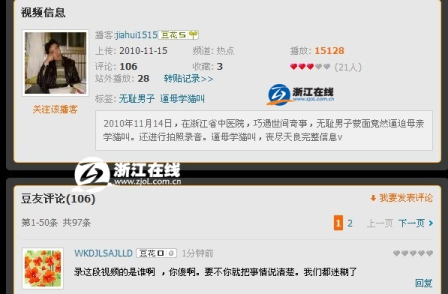 正當(dāng)網(wǎng)友為此而感動(dòng)時(shí),一個(gè)《無(wú)恥男子逼母學(xué)貓叫》的視頻也在網(wǎng)上流傳,視頻中一位蒙面男子在醫(yī)院“逼”一位母親當(dāng)眾學(xué)貓叫,引來(lái)罵聲一片。這其中,既有人罵“逼”者不人道,又有人贊母親之偉大,稱(chēng)是“慈母貓叫”、現(xiàn)代版的“鹿乳奉親”。視頻中的母親,正是當(dāng)眾學(xué)唱《春天里》的董觀榮,一位已經(jīng)49歲的媽媽。