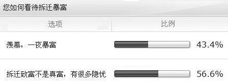 但是,新浪網針對“拆遷暴富”進行的一項網友投票卻顯示,56.6%的人認為“拆遷致富不是真富,有很多隱憂”。