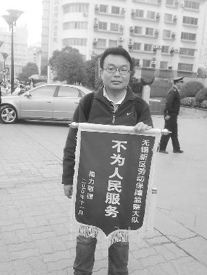 其實(shí)我一共做了三面錦旗。最早的一面9月份做的“起訴通用工會(huì)法院不受理”,給無錫新區(qū)法院的。“不為人民服務(wù)”是給勞動(dòng)保障監(jiān)察大隊(duì)的。第三面還是給法院的,寫的“行政訴訟立案難”,還沒送出去。現(xiàn)在看來第二面最受歡迎。