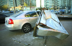 昨日,西三旗一處地鐵工地的一簡易房被大風吹到隔壁小區砸中一輛車。當日,北京刮起8級大風。記者 浦峰 攝