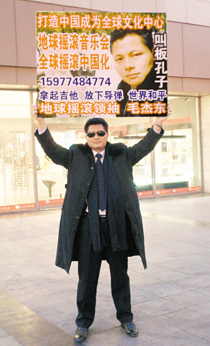 毛杰東站在鬧市區,手舉大牌子,上面“叫板孔子”四個字分外扎眼。他認為,在中國文化的傳播上,孔子并不“稱職”。他舉例說,足球的雛形蹴鞠早在春秋戰國就在中國出現,作為當時最偉大的思想家、教育家,孔子沒有將足球文化推廣開來,導致足球運動在西方發揚光大。而他要在中國舉辦全球搖滾音樂會,承擔起文化推廣重任,通過搖滾樂將中國打造成全球文化中心,走遍各大城市就是為其做宣傳。“很多人說我是瘋子,但這是我的目標!”男子坦言,“叫板孔子”不過是其想出來的噱頭,想為全球搖滾演唱會帶來人氣,面對炒作的質疑,他并不諱言。