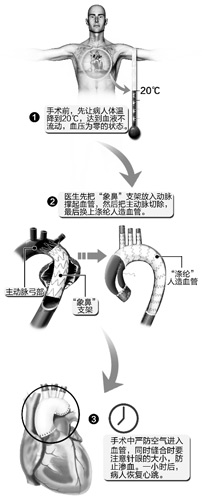 心臟停跳,全身被“速凍”至20攝氏度……無影燈下生死時速,外科醫(yī)生爭分奪秒,以最快的速度打開病人胸腔,快速切掉破損的心臟上端人體最大的血管,植進一種高分子滌綸材料做的替代品……24分鐘補完心臟血管,一小時后,患者成功恢復(fù)心跳。