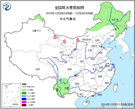 8日08時(shí)至9日08時(shí),新疆北部、內(nèi)蒙古東北部、黑龍江、吉林大部、遼寧東北部等地有小到中雪或雨夾雪,其中,黑龍江東南部、吉林東北部局地有大雪,局地暴雪;云南等地有小到中雨或陣雨。新疆東北部、甘肅、內(nèi)蒙古中西部等地有4~6級(jí)偏北風(fēng)或偏西風(fēng)。甘肅西部、內(nèi)蒙古中西部的部分地區(qū)有揚(yáng)沙或浮塵。渤海、黃海大部海域?qū)⒂?~7級(jí)、陣風(fēng)8級(jí)的西北風(fēng);東海大部海域?qū)⒂?~7級(jí)西北風(fēng);臺(tái)灣海峽、臺(tái)灣以東洋面和以南海域、南海西北部海域?qū)⒂?~6級(jí)東北風(fēng);南海東北部、中部和西南部海域?qū)⒂?~7級(jí)、陣風(fēng)8級(jí)的東北風(fēng)。