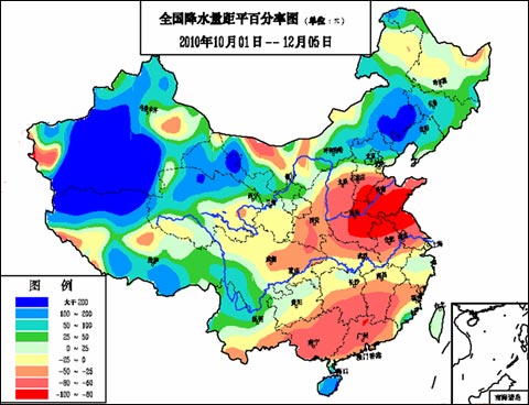 2010年10月以來降水距平百分率分布圖顯示,