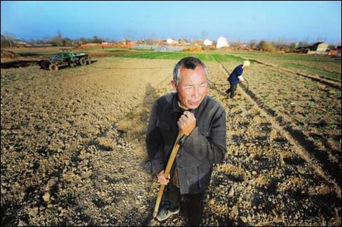 12月3日下午,安徽省長豐縣水湖鎮孔圩村,59歲的孔憲華正在和老婆用拖拉機拉水,準備在沒長出麥苗的田里補種油菜。該縣約30萬畝農作物受干旱威脅。(來源:新安晚報)