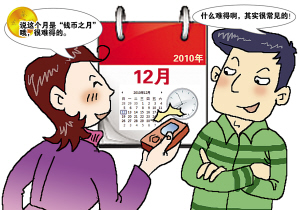 任意一月中出現(xiàn)5次星期三、星期四、星期五,就更常見了。吳志倫說,任意一月出現(xiàn)這樣的情況是在2009年7月,下一次是在2012年8月。他推算了2000年至2050年之間,這樣的“錢幣之月”多達51次。