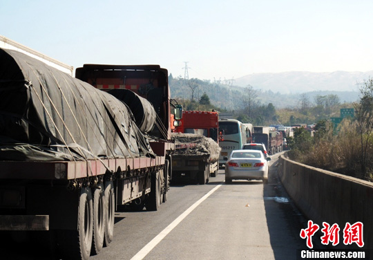 因強冷空氣降雪結(jié)冰給交通帶來嚴重影響,北方貨運車輛無法南下,京港澳高速公路粵北段冰封受阻后,大量南下貨車只得滯留在湖南境內(nèi)等待高速公路解封。17日下午,南北交通全面恢復(fù),得到信息的南下貨車匆匆蜂擁而下,給剛剛恢復(fù)通行能力的道路帶來新的擁堵,先后多處出現(xiàn)長達十余公里的車龍。