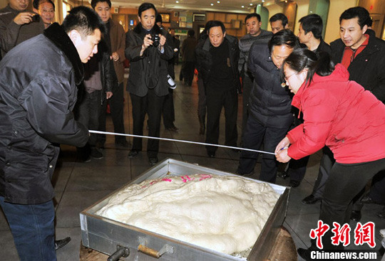 據介紹,該水餃,長1.2米、寬0.86米、重達158斤,用了足足三袋面粉、60斤餃子餡。而該大水餃的肚中還包有2011個小水餃,這些小水餃有豬肉、羊肉和白菜、韭菜等60多種風味的餡包成,夠100多個人同時吃飽。在該縣公證處等有關部門的監(jiān)督下制作完成的特大水餃將申報世界吉尼斯記錄。