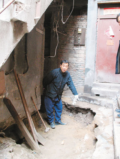 25日上午,記者來(lái)到人民西巷36號(hào)院,此時(shí),通往后院的必經(jīng)路已經(jīng)完全塌陷,形成一個(gè)12平方米的塌陷面。住戶們正不斷地?cái)嚢柚匙雍退啵瑢?duì)大坑進(jìn)行回填。塌陷的大坑致使兩戶居民房屋部分懸空。