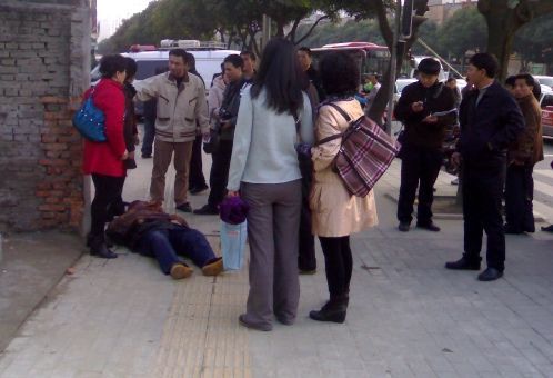 老人趴在人行道上,緊閉著雙眼,嘴角往外流著血,雙手似乎還微微顫抖著。“還活著吧”,有人這樣說道。