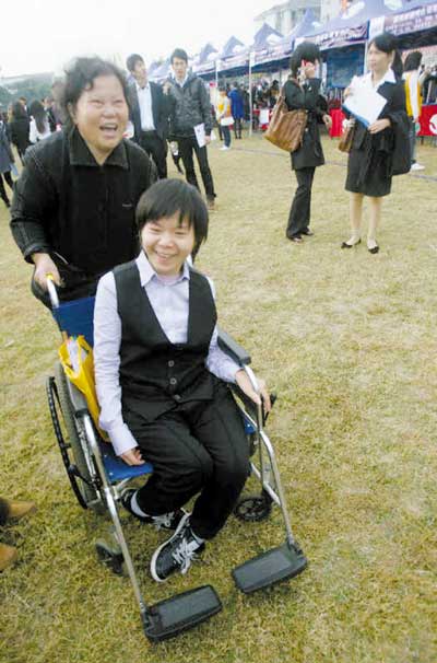 上月23日,2011屆高校畢業生招聘會從化專場在廣東外語外貿大學南國商學院舉行。現場有一名坐在輪椅上的女孩,被一位頭發花白的老太太推著,穿行在眾多穿著正裝的求職人群中,尋找適合自己的職位。
