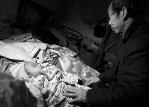 老人撫摸一對龍鳳胎孫子孫女。因妻子生產后身亡,孫雪峰將兩家醫(yī)院告上法庭。昨日,該案進行了鑒定質證。記者 吳江 攝