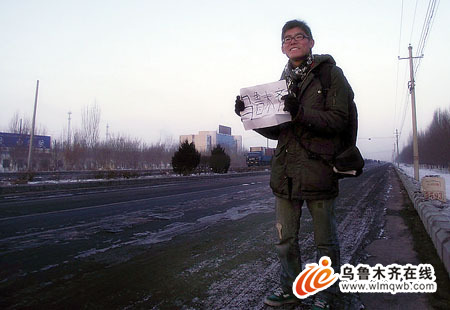1月6日,天剛蒙蒙亮,在312國道哈密段3593千米處,胡蓓蕾展開寫有“烏魯木齊”的紙牌,微笑著在路邊搭車。(本人供圖)