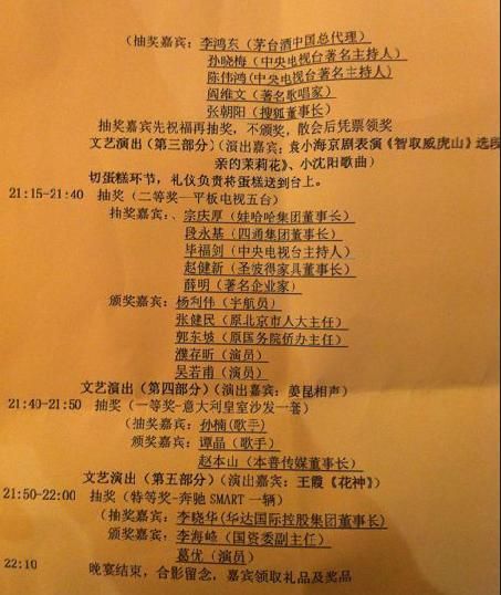 有媒體拍攝了晚宴的詳細(xì)節(jié)目流程。從流程來看,長達(dá)兩個多小時的晚宴共安排了5個部分的文藝表演,其中袁小海表演了京劇《智取威虎山》的片段、小沈陽獻(xiàn)唱了歌曲、姜昆更是現(xiàn)場表演了即將在春晚上演唱的相聲……閻維文、孫曉梅、畢福劍、濮存昕、吳若甫、譚晶、孫楠、趙本山、葛優(yōu)等則分別擔(dān)任了現(xiàn)場各抽獎環(huán)節(jié)的嘉賓。