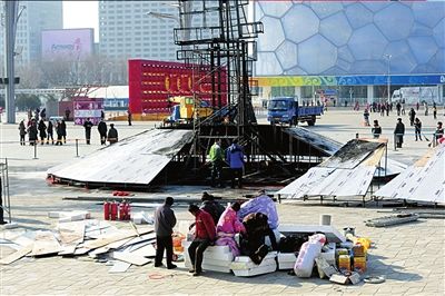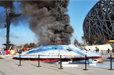 昨天中午,國家體育場西側(cè)50米處,一座正在施工中的塑料雕塑“祥云玉兔”突然起火。當(dāng)事工人稱,可能是焊接點(diǎn)濺出火花,引燃底座的泡沫材料,致使整體結(jié)構(gòu)起火。