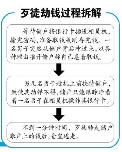 “我剛把密碼輸進(jìn)去,幾個(gè)男人就上來(lái)一把推開(kāi)我,然后強(qiáng)行把我卡里的錢(qián)轉(zhuǎn)走,這個(gè)過(guò)程只有一分鐘左右,我根本就不能反抗。”昨日,在厚街經(jīng)商的李先生向記者講述了他取錢(qián)時(shí)遭遇歹徒強(qiáng)行轉(zhuǎn)賬的案情。而在之前,同樣是在厚街工作的郭小姐也遭遇過(guò)相似的情況,兩人分別損失了4萬(wàn)多元。