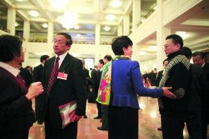 入場前,委員們在攀談。昨日下午,全國政協十一屆四次會議第四次全體會議召開。本報記者 韓萌 攝