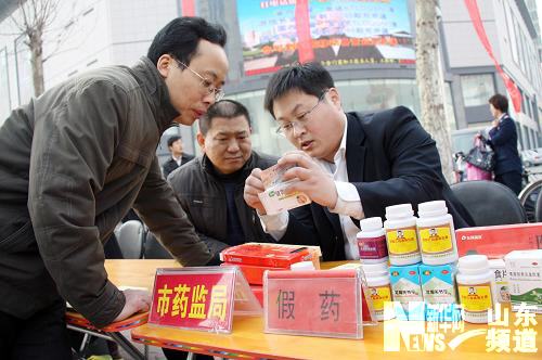 3月13日,山東省聊城市藥監部門工作人員在“3·15消費者權益日”宣傳咨詢服務活動現場為市民講解假藥的識別方法。
