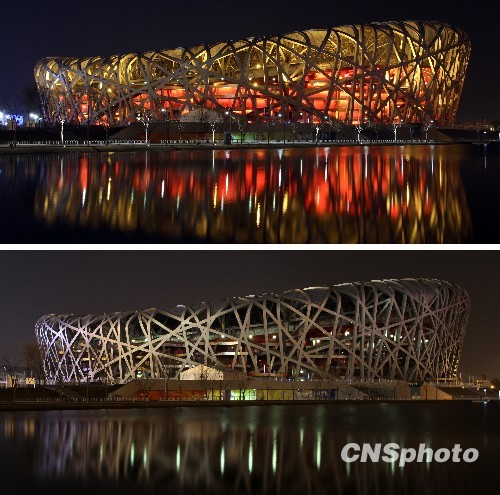 2010年3月27日晚8:30-9:30,“地球一小時(shí)”活動(dòng)期間,國(guó)家體育場(chǎng)“鳥(niǎo)巢”關(guān)閉景觀照明,號(hào)召人們關(guān)注氣候變化帶來(lái)的挑戰(zhàn)。 中新社發(fā) 余明 攝