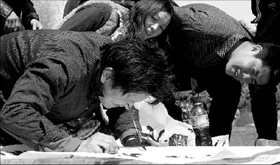 不一會兒,“厚德載物”4個大字寫完了,他把耳孔內的毛筆取出,看著自己的作品點了點頭。